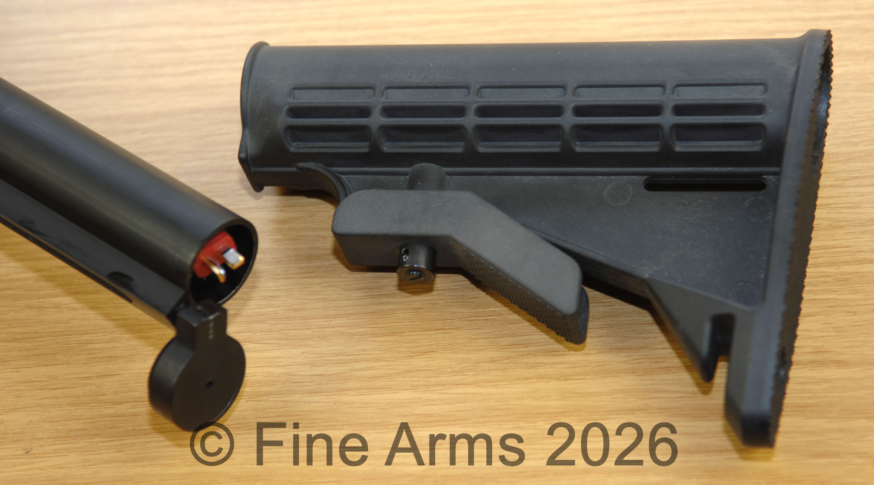 Die Unterbringung des Akku ist im Rohr der Schulterstütze vorgesehen. Hierzu wird der Akku mit Deans T-Stecker unter der Kappe des Schaftrohres eingesetzt. Daher die Abmessungen für einen Lipo beachten.